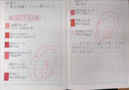 日本に伝わる赤系の色の微妙な違いを示しながら、色の名前を整理しました。