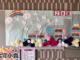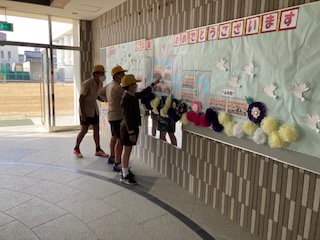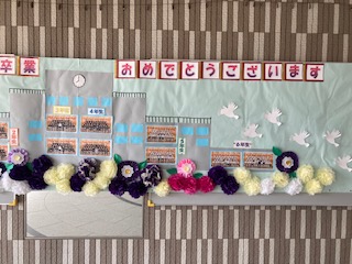 1年生から6年生までの学級写真を掲示しています。「こんなに小さかったんや!」と驚きの声をあげています。