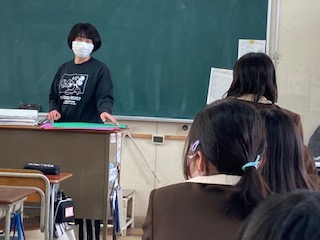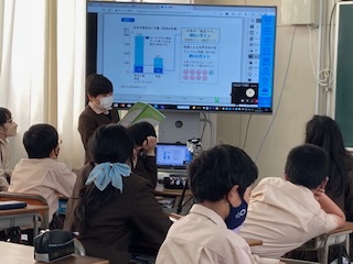 資料を活用して、説得力のある提案をしています。テーマは、「食品ロス」です。自分の経験なども入れ、グラフや表から読み取って考えたことを提案しています。互いに聞き合って質問をしたり、良いところを見つけたりしました。