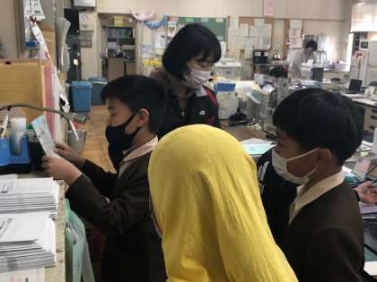 雨で運動場が使えないので、健康委員会が廊下や階段を走らないよう包装で呼びかけています。
