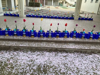 式場前のチューリップは、新2年生が植えたものです。きれいに咲き揃っています。桜の花びらの絨毯も、1年生の入学を喜んで迎えているかのようです。
