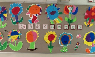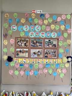 廊下にお祝いのメッセージを掲示しています。みんな、1年生の入学を楽しみにしています。