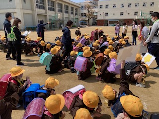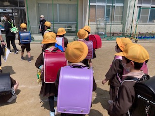 赤、青、黄色といきいき、学童の五つのコース別に並びました。それぞれの担当の先生の引率のもと、下校しました。