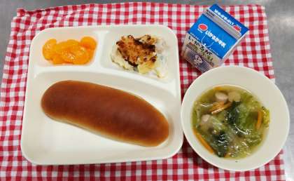 今日から給食が始まりました。初日は子ども達に人気のマカロニグラタン、レタスのスープ、みかんの缶詰め、黒糖パン、牛乳です。学校のグラタンはルウも手作りです。一年生からも「おいしかった!」の声が聞けました。