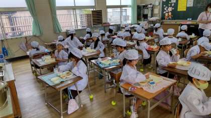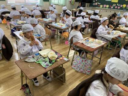 今日から1年生も給食が始まりました。一生懸命運んだり準備したり頑張っていました。黙食もきちんと理解できていて、小声で「おいしい」と教えてくれましたよ。