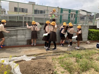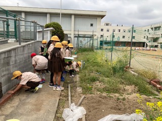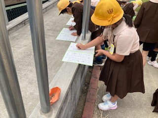 学習園で虫の観察をしました。蜘蛛やダンゴムシ、てんとう虫の幼虫、モンシロチョウなどたくさん見つけ、カードに書きました。