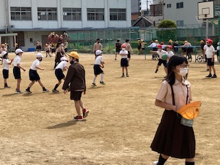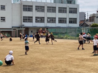 2時間目と3時間目の間は、15分の休み時間があります。子ども達は、元気いっぱい遊んでいます。「帽子を被りましょう」「水分をとりましょう」などの呼びかけも健康委員会児童が放送しています。