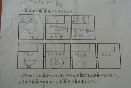 6年生では、朝食の大切さを確認した後で、主食、主菜、副菜、その他の4つのバランスのとれた組み合わせについて学びました。