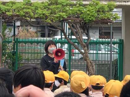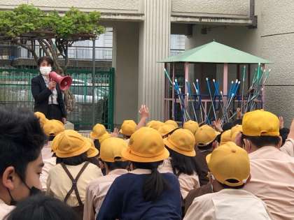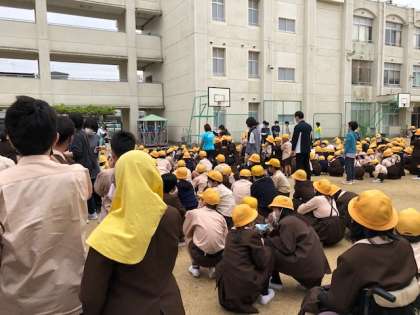 の約束のもと、避難経路を確かめながら3分半ほどで全校児童の避難が完了しました。