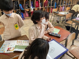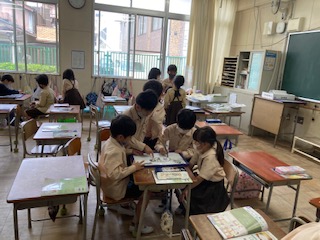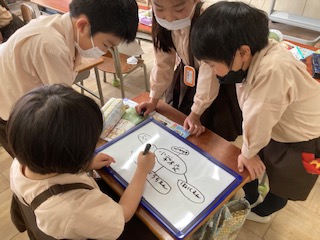自分たちの住む町には、どんなものがあるか、グループで考えています。知っている建物、場所などを今度町探検をして確かめていきます。