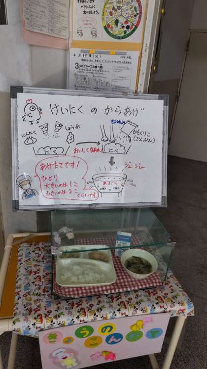 今日は、鶏肉のからあげ、中華スープ、チンゲンサイともやしの甘酢あえ、ごはん、牛乳でした。唐揚げは給食室で丁寧に下味と衣をつけて揚げています。今日から今年度の給食委員会が給食時間に放送をしてくれます。