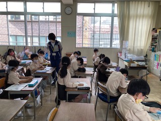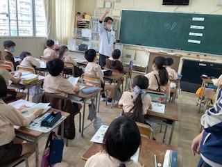 名前と好きなものを書いたカードで「どうぞよろしく」とあいさつをします。PCでローマ字打ちを2年生から行ってきたので、名前をかける子がたくさんいました!