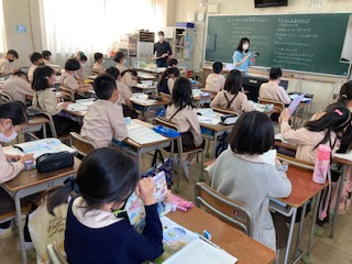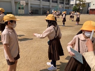 気温を調べるために、運動場に出て、温度計の使い方、読み方を練習しました。
