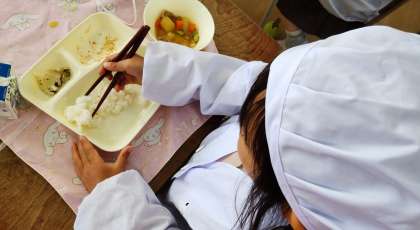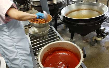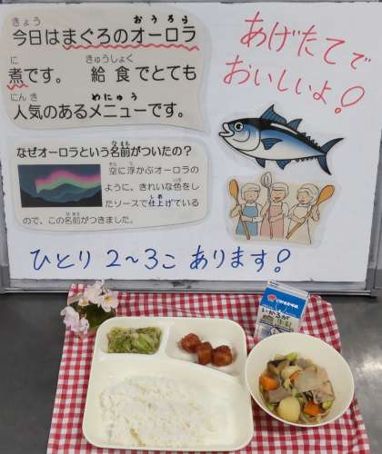 今日は人気メニューのまぐろのオーロラ煮と、豚肉と野菜の煮もの、キャベツの赤じそあえ、ご飯、牛乳でした。下味をつけたマグロに衣をつけて油で揚げます。熱いうちに砂糖や赤みそで作った特製のオーロラソースにあえて出来上がりです。「魚は苦手」と心配していた子も「おいしい」と言っていました。