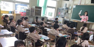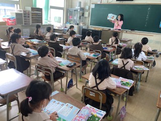 あ・い・う・え・おはそれぞれ方の形が違います。先生の口の開け方を見て練習しました。その後、「あいうえおのうた」を北の形に気をつけて読みました。