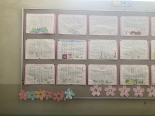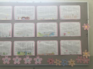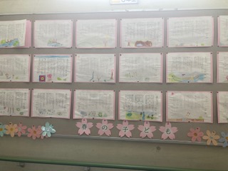 C階段の2階踊り場に、国語科で学習し、視写した「春のうた」を掲示しています。