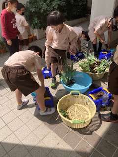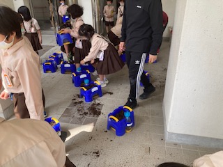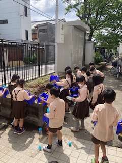 休み時間に、咲き終わったチューリップの鉢をきれいにしました。球根はこのまま乾かして残しておき、秋に植えて来年の春にまた咲かせます。