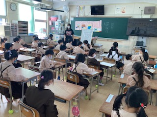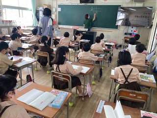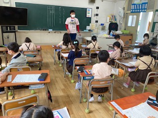 黒板に書かれた事柄を写して連絡帳を書いています。まだひらがなは全部習っていませんが、黒板をしっかり見ながら、丁寧に書いています。