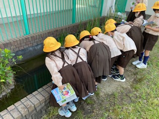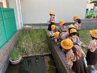 四角い池に亀がいないか、興味津々の一年生です!