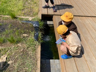 メダカやタニシ、テントウムシなどを見つけました。生活科の「手のひら図鑑」を見ながら確かめています。
