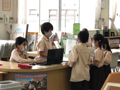 15分休みに図書室で、本の貸し出しを担当する5年生。