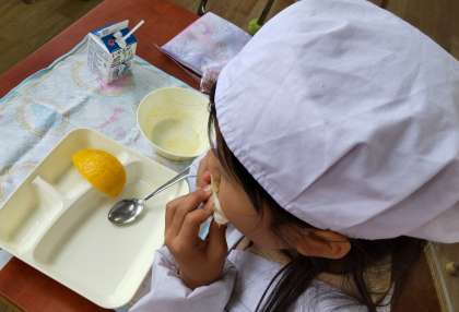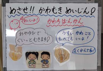 今日の給食には、河内晩柑(かわちばんかん)という果物が登場しました。分厚い皮の果物は4月の甘夏かん以来です。「かわむき名人なれたよ!」と1年生も言いに来てくれました。旬の果物にはビタミンがたっぷりです。ご家庭でも、みんなでかわむき名人にチャレンジしてみてください。