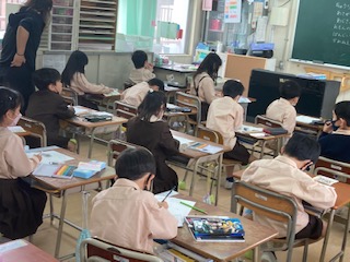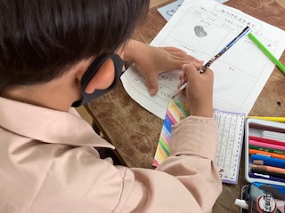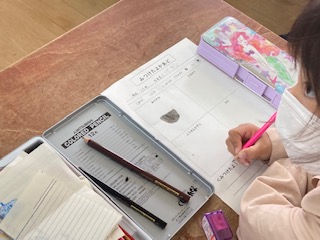 アサガオの種を上から、横からよく見て、カードに書きました。形だけでなく色も真っ黒でないことにも気づきました。