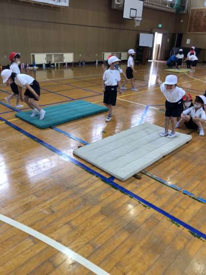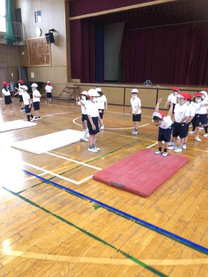 初めての立ち幅跳びですが、膝を使って、腕を振って、より遠くへ遠くへ跳べるように、何度も繰り返し跳びました。