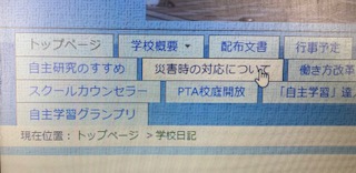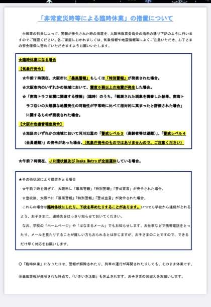 本日「非常変災時等による臨時休業のお知らせ」の手紙を配布しています。ご確認ください。