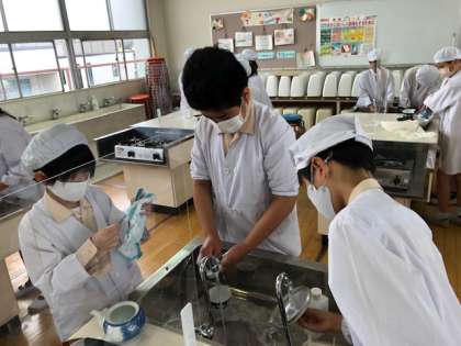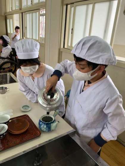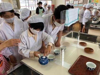 お湯をわかしてお茶をいれる実習を行いました。おわんへの注ぎ方、片付けの仕方なども含め、安全に気をつけてグループで協力しながら楽しく実習することができました。