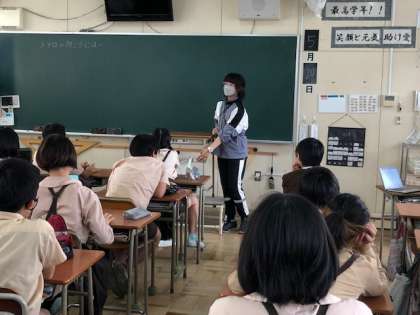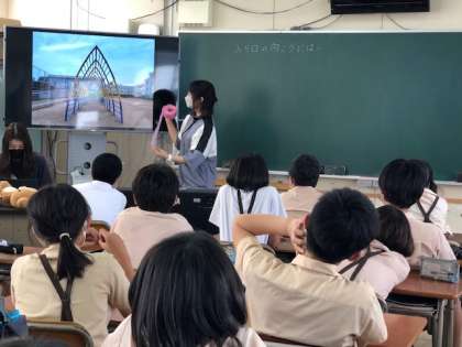 運動場に出て、入口に見えるような場所を探し、一人一台端末で撮影しました。オシャレに飾りつけるのにふさわしい場所をグループで探しています。