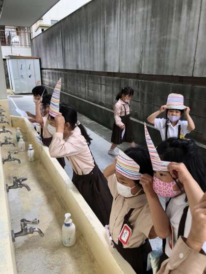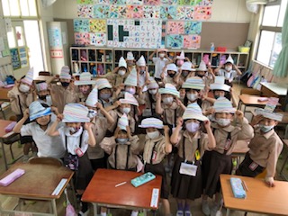シルクハット、キャップなど、画用紙を好きな形に切り取り、帽子を作りました。パスを使って真っ直ぐ、ボーダー柄の模様を描きました。3色ボーダー、カラフルボーダーなど、選んだ色合いも個性が光ります。出来たら、似合うかどうか鏡で見てみました。