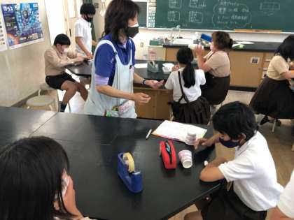 科学工作クラブでは、紙コップとアルミホイル、ビー玉を使ってふしぎなマラカスを作りました。ビー玉をアルミホイルでくるんで中に入れることで、ビー玉が不思議な転がり方をするのがおもしろいですね。