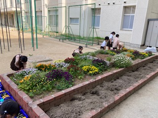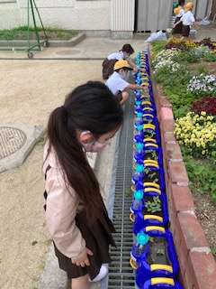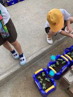 登校して準備が整ったら、アサガオの水やりをしています。「種を6こまいたのに、なんで出てこないんかな?」「これからどうなっていくのかな。楽しみ!」など、いろいろ思いながら水やりをしています。