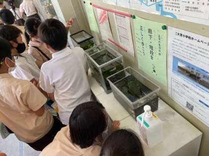5年生が学習しているメダカが、職員室の水槽にたくさん泳いでいます。「あ、これオスや。こっちはメスや。」など、学習したオスメスの見分け方思い出して観察していました。