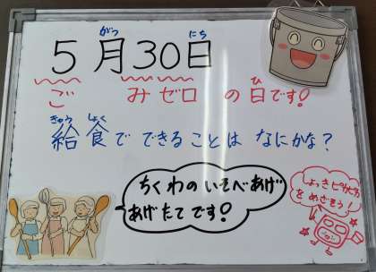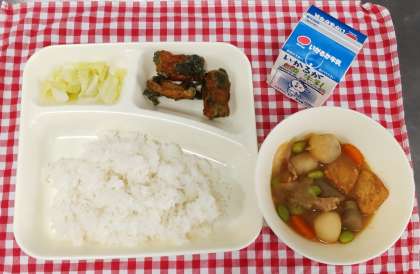 今日はちくわの磯辺揚げ、厚揚げと里芋の煮物、あっさりキャベツ、ご飯、牛乳でした。丁寧に衣をつけたちくわは給食室で揚げたてを用意しました。
