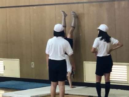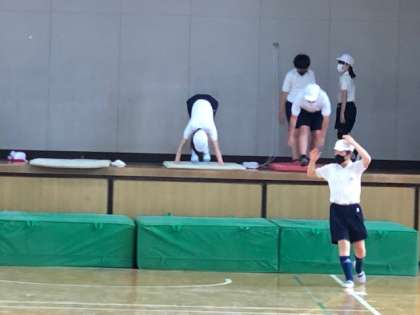 マット運動に取り組んでいます。友達同士で支えあいながら壁倒立やいろいろな前転にチャレンジしています。