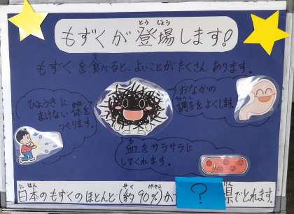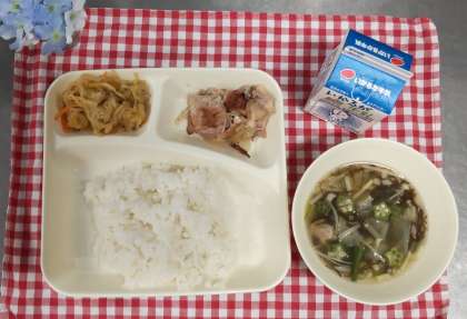 今日は豚肉の甘辛焼き、もずくとオクラのとろり汁、切り干し大根の炒め煮、ご飯、牛乳でした。もずくは沖縄でたくさんとれ、汁物や酢の物、揚げ物など色々な料理に使われています。