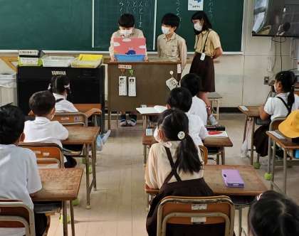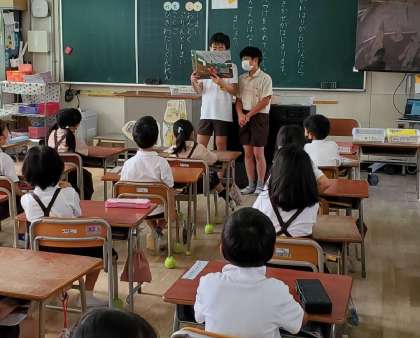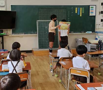 金曜日の朝は、全校読書タイムですが、2週間に一度、図書委員会児童が読み聞かせに低学年の教室を回っています。