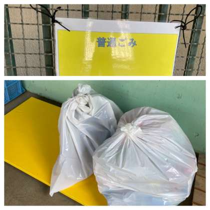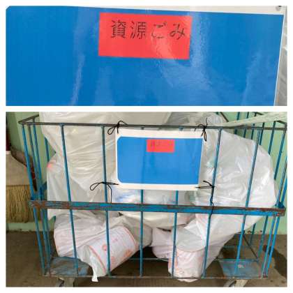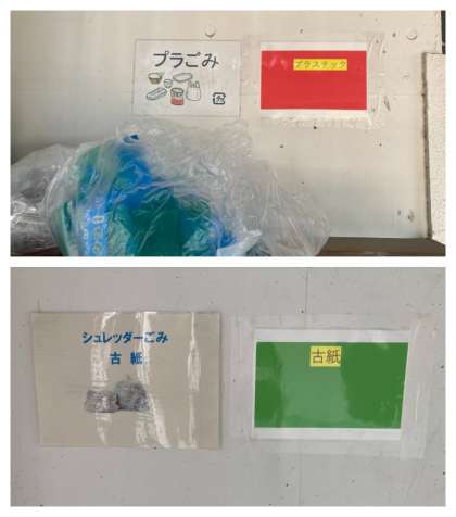 ごみを分別して出していますが、ごみ置き場の置き場がわかりにくく、混ざってしまって収集されないこともありました。そこで、一般ごみは黄色の台の上に、資源ごみは青い表示のあるかごに、プラごみは赤い表示のところに、古紙・シュレッダーごみは、緑の表示のかごの中にというふうに色分けをして置くことにしました。