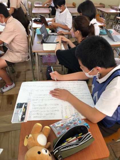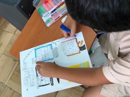 「防災ポスターをつくろう」の発展学習として、友達の関心をひくようなポスター作りに取り組んでいます。