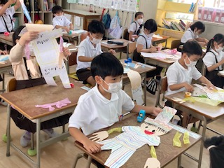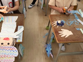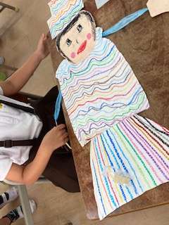 線で描いた洋服や帽子を着た人形が仕上がりました。線を最後までしっかり描くという学習です。かわいい姿に思わずにっこり!