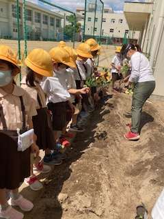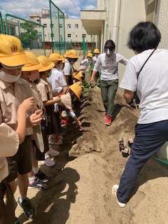 サツマイモの苗を植えました。国語科の「サツマイモの育て方」の学習と関連させながら、育てていきます。