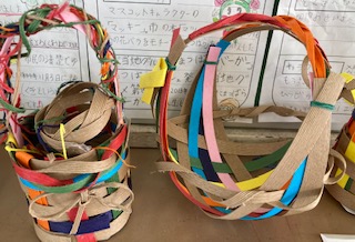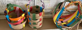 紙のテープを折って、かわいいかごを作りました。色や形など個性が溢れています。