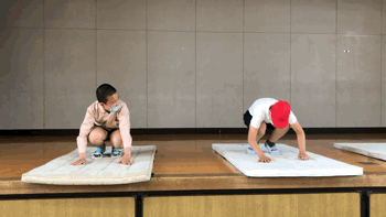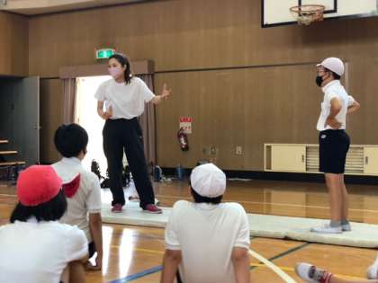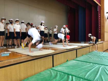 マット運動では、自分の目標を立てて、ペアで教えあいながらさまざまな技の体得にチャレンジしています。