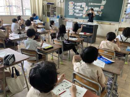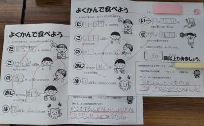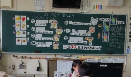 3年生では「よくかんで食べよう」の学習をしました。「たこのあじはいーぜ」に合わせて噛むことの効能を知り、よく噛むための工夫を考えました。唇を閉じてこめかみが動くように一口30回噛むことがコツです。おうちでもチャレンジしてみてください。