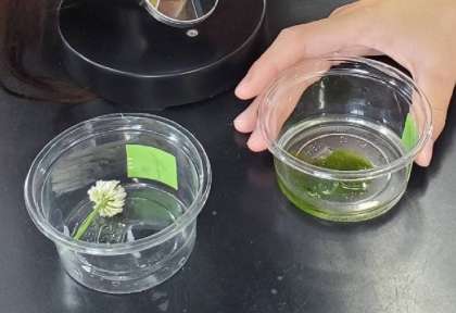 ビオトープで観察したいものを採取して、顕微鏡で見ました。