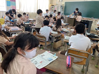 来週から毛筆の学習が始まります。作品を入れる新聞紙綴りを作っています。