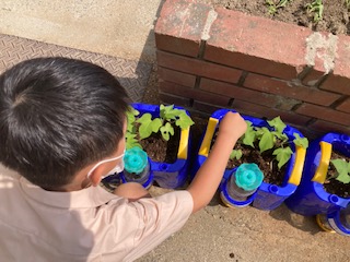 アサガオの本葉が大きくなってきました。肥料をパラパラと土の上にまきました。