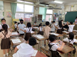二人組で、歌に合わせてたんとうんのリズムをとりながら手拍子をしました。どの組が上手だったか、お互いに見合いっこをしました。